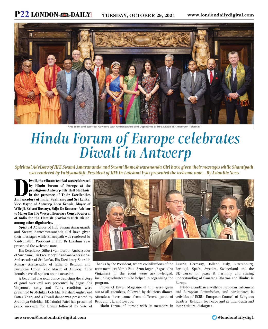 El pasado 22 de octubre de 2024, H.E. Pujya Swami Rameshwarananda Giri Maharaj, consejero espiritual del Hindu Forum of Europe (HFE), acudió junto a Swamini Dayananda Giri a la celebración anual de la festividad hindú de Diwali en la ciudad belga de Amberes.